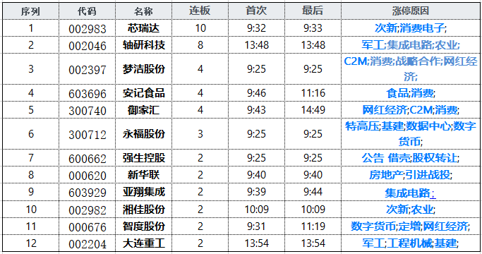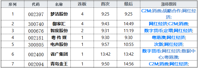 强势股热度升温,8板大妖出现,网红+集成电路+消费概念活跃 缩量横盘,很难出现持续爆发的热点,因为人气尚可,焦点股优势就开始显现,适合出单独的大妖股;两市涨停61只,其中开板23只,封板率72.62%,而连板股还有12只,还出现8板大妖股,缩量没持续性热点妖股容易吸引人气;持续性的题材并不多,但有几个点还是比较有意思,消费、网红、次新以及数据中心+集成电路,很难大规模爆发,但有些个股会走出来。 1. 焦点股 指数缩量,并且没有大方向,很适合出妖股,而且也有8板大妖出现,有些焦点股将会成大热点;这算是一个新的方向。 轴研科技:8连板,集成电路+军工,已经打出了高度,而且也给市场一个方向,对于大妖会有反复炒作,虽然一般情况下第一波极限是10连板。 省广集团:虽然没有连板,但也十分正宗的一只,很具有代表性,数据中心+抖音+数字货币,现在数据中心会出大趋势股,也有大游资加持,例如沙钢股份,而且省广集团还是抖音国际版出海代理,这个点也能出大趋势龙头;一只大趋势股。 梦洁股份:C2M+消费+网红,而且牵手薇娅,股价直接爆了,4个一字板,终将是大妖股,溢价板也可以赌。 湘佳股份:近端次新+农业,而且还是质优股,加上一季度业绩暴增,这类股很容易走大趋势。