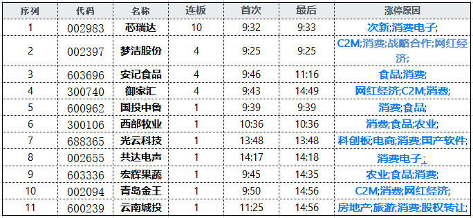 2. 消费 启动分析:国务院促进中小企业发展工作领导小组第六次会议召开。努力扩大总需求。要加快重大项目投资、促进民间投资,努力扩大居民消费需求。加强线上线下融合,稳步推动批发零售、住宿餐饮、文化、教育、医疗、养老、旅游等服务业需求的正常化。 提振消费依然是主线,不过题材热度高的是网红+C2M这个分支,其他很多股都是走趋势,今天消费电子股又开始走强,但也是趋势为主。 芯瑞达:开板次新+消费电子,比较质优,开板后调整充分,走趋势的预期更强一些,近端次新没有大的看点,目前来看出大妖也不容易。 梦洁股份:消费+网红+C2M,牵手薇娅,4板一字,大概率可以出大妖,赌溢价板。