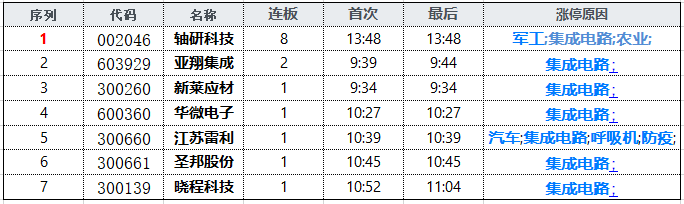 5. 集成电路 启动分析:13日晚间,中芯国际发布一季度财务数据,营收同比增长35.3%,创历史新高。公司决定将2020年资本开支进一步上调至43亿美元,以充分满足市场需求。在目前市场环境下,设备国产化率也有望持续提升。 国产替代预期,而且中芯国际还出了一个概念大妖股,对整个题材也有带动;不过目前来看,集成电路很多股走趋势。 轴研科技:8板大妖股,军工+集成电路,目前来看是炒作中芯国际供货概念,后面市场会去找对标股。 亚翔集成:中端次新,2板,中芯国际是重要客户,前排股。